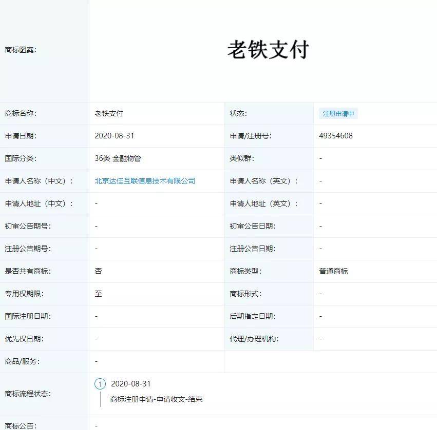 最近,小编看到网上有了关于快手上市的传闻。 有外媒报道称我国短视频平台快手准备在香港上市,拟募资50亿美元,寻求估值达500亿美元。据路透援引知情人士透露,快手已聘请美国银行(Bank of America)、华兴资本(China Renaissance)和摩根士丹利(Morgan Stanley)负责IPO,希望最早在10月底提交上市申请。 针对此消息,快手对媒体回应称:不予置评。 其实早在2019年底,市场就传闻快手获得30亿美元融资,由腾讯领投,不过当时的估值为300亿美元。 很多人对此报以观望状态,毕竟在抖音的攻势下,留给快手的机会和市场已经越来越小了。如果快手真的要开启500亿美金上市计划,就必须重仓内容电商。 内容电商指的是商家利用平台来做内容,相比于传统电商的满足需求而进行活动引流,内容电商更着力于“创造需求”。这是一种将商品的体验感传递给消费者,用有价值的内容刺激用户消费的一种场景式电商销售模式。 内容电商其实分很多种,比如说图文、视频和直播等等,这些都属于“内容”的范畴。 这些年来,公司一直在尝试做好内容电商,比如美丽说、蘑菇街、小红书等平台,甚至包括一部分自媒体,可体量上一直很难做上来。 倒是快手有望见到黎明的曙光,他们从短视频到电商,已经成功打通了商业闭环,并且成为了全国第四大电商平台。 不错,既然决定要发展好内容电商,那么很多东西就得快手自己做出来,不能再依赖第三方平台,尤其是支付这块儿。 要知道任何电商闭环的成立,都需要供应链自主。 不使用阿里巴巴或腾讯的支付平台用什么呢? 自己鼓捣出一个呗。 最近发现快手的关联公司——北京达佳互联信息技术有限公司于今年8月31日申请注册“老铁支付”商标,其中国际分类包含第9类科学仪器、第36类金融物管、第41类教育娱乐、第45 类社会法律等。 据了解,北京达佳互联信息技术有限公司成立于2014年7月2日,公司法定代表人为杨远熙,关联公司包含北京华艺汇龙网络科技有限公司、北京一笑科技发展有限公司等。 此外,该公司还申请注册了“老铁好货”、“老铁严选”、“老铁电商”等一系列与“老铁”有关的商标。